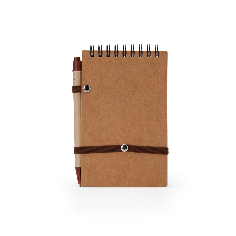 Bloco de anotações ecológico com caneta, feito em kraft com detalhe plástico. Contém aproximadamente 70 folhas brancas com pauta, porta caneta elástico, elástico para lacre e acompanha caneta de papelão com detalhes plásticos, carga esferográfica azul 1.0mm e acionamento por clique. Acesse Aqui a Linha completa de bloco de notas personalizados.