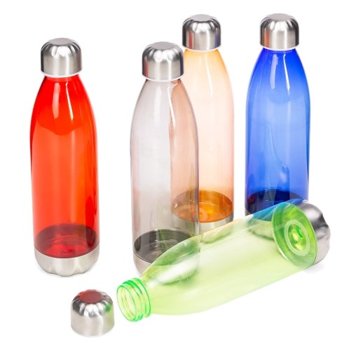 SQUEEZE PLÁSTICO 700ML SQ173G – Squeeze plástico 700ml formato garrafa. Corpo transparente colorido, possui tampa e base em alumínio.