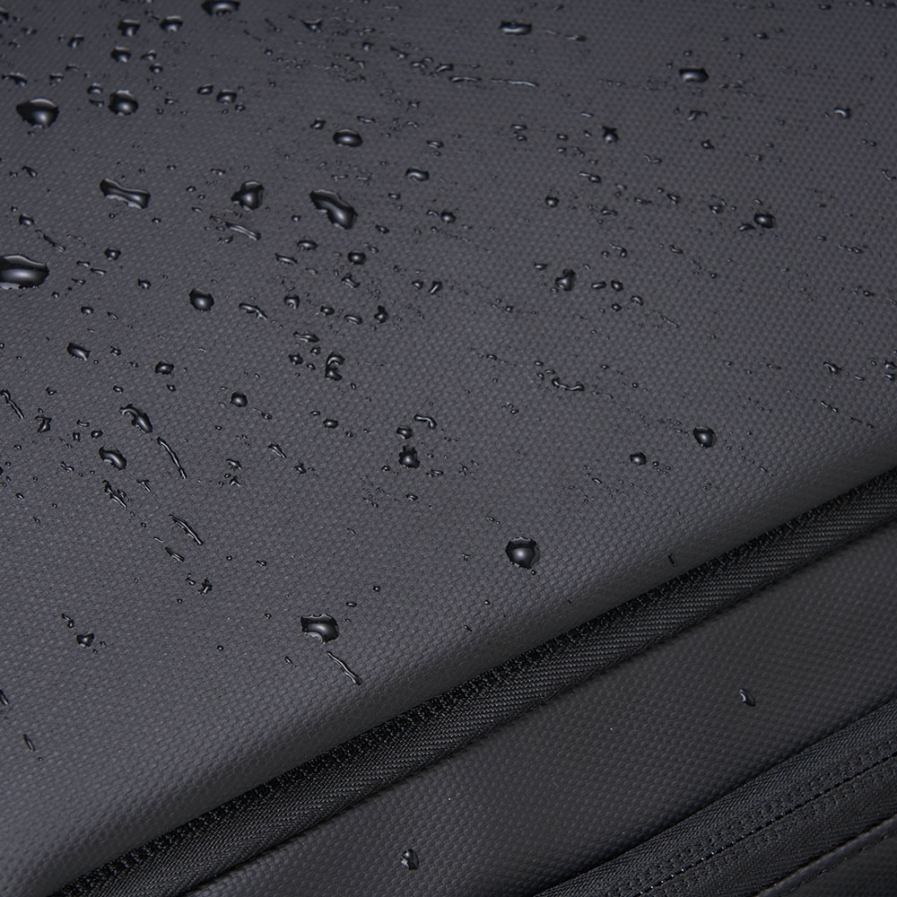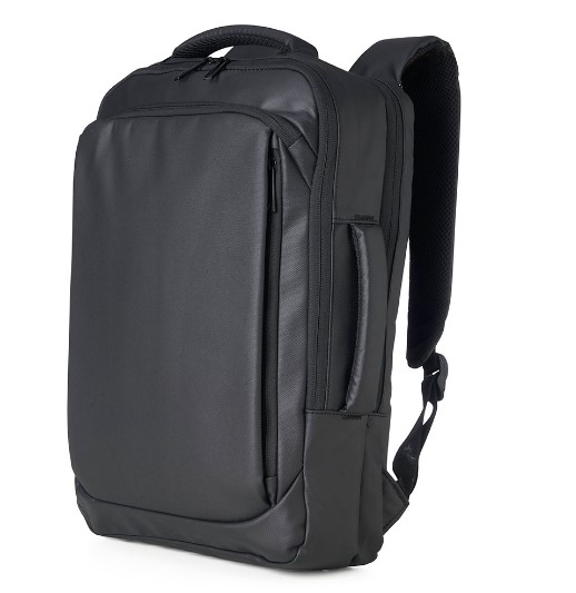 Mochila em couro sintético 17 litros resistente à água com cinco compartimentos, sendo o principal com bolso para notebook 156. Com divisórias internas para acessórios, a mochila possui suporte externo usb, alça para encaixe em malas de viagem e duas alças de mãos, sendo uma delas lateral para o transporte da mochila no modo pasta.
